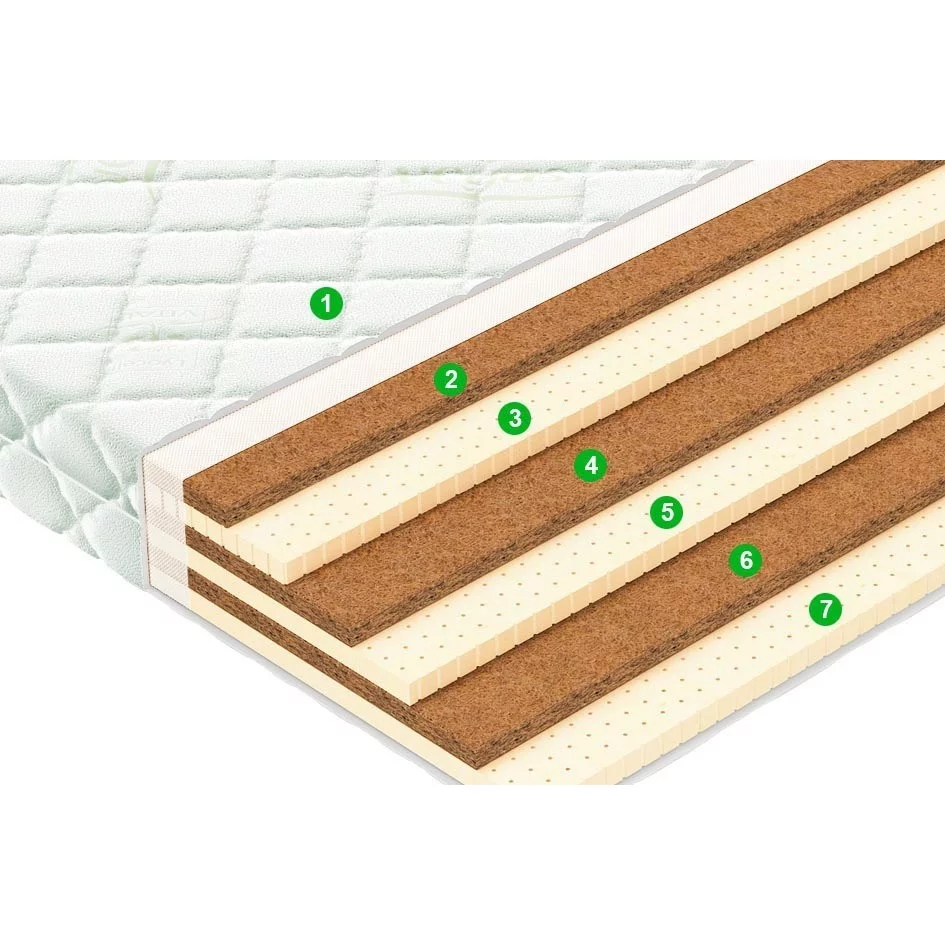 Среднежесткий, симметричный матрас, двухспальный / односпальный, ширина 70 ... 140 см, длина 140 ... 200 см, высота 13 см, базовый блок: беспружинный, настилочные материалы: латекс: 20 мм. Кокосовая койра: 10 мм., Съёмный чехол. Тип ткани чехла: трикотаж. Стёганый чехол.