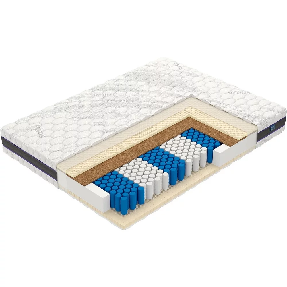 Среднежесткий / средний, двухспальный / односпальный, ширина 80 ... 200 см, длина 186 ... 200 см, высота 22 см, базовый блок: независимые пружины, настилочные материалы: латекс. Термоскрепленный войлок. Кокосовая койра., тип ткани чехла: трикотаж с антибактериальной обработкой. Стёганый чехол.